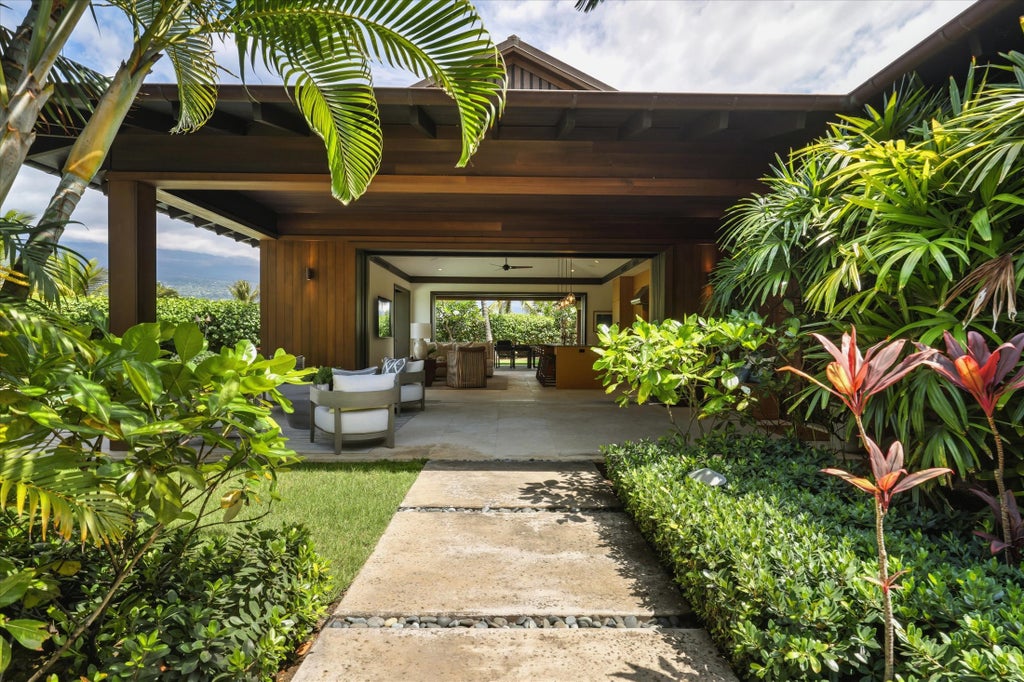 Ideal for both relaxation and entertaining, the lānai is perfectly positioned for peaceful mornings and tranquil sunrises over Hualālai. The outdoor space includes dining and lounge areas, a private pool, and a spa, all surrounded by lush greenery and the serenity of island living.
