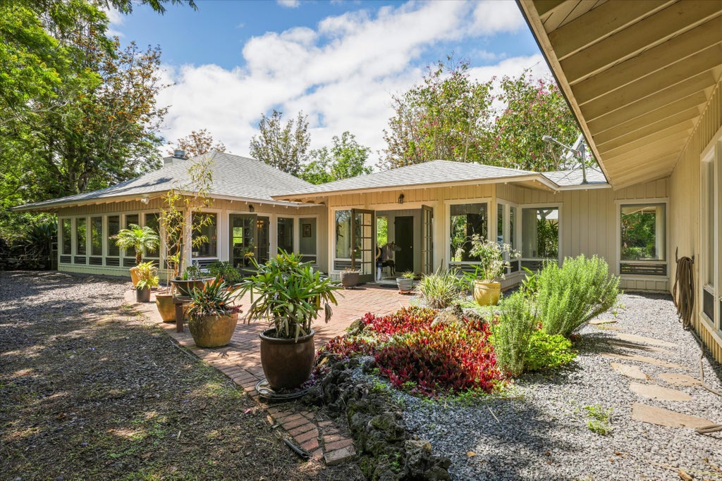 Nestled within the prestigious gated community of Puu Lani Ranch, this 3-bedroom, 3-bath home offers a blend of modern craftsmanship with a rustic touch, making it a perfect sanctuary for tranquility and comfort. Situated at a soothing elevation of approximately 2,300 feet on the gentle slopes of Mauna Loa, this property promises sensational weather year-round. As you step into the expansive 2,672-square-foot, sprawling ranch-style home, you are greeted by a unique architectural design featuring open-beam ceilings that elevate the sense of space and freedom. The great room, truly the heart of this residence, is surrounded by windows with ventilated louvers. The wood-burning fireplace is ideally situated between the kitchen and living areas. The master suite is a retreat within itself, featuring glass walls on three sides that integrate the lush, private forest setting outside. It includes a walk-in closet, a tile-lined shower, and a separate soaking tub. Two additional bedroom suites, one of which doubles as a mudroom with an outdoor shower, all bedrooms, and the laundry room, open directly to the outdoors. Upgraded in November 2019, the home’s roof is a paragon of maximum energy efficiency. It features four layers of cutting-edge materials: an underlayment, plywood sheeting, a super-tech shield membrane, and Landmark Pro-certified asphalt shingles. The home is situated on a flag lot and is not visible from the road, offering maximum privacy. Please do not drive to the home without an appointment.