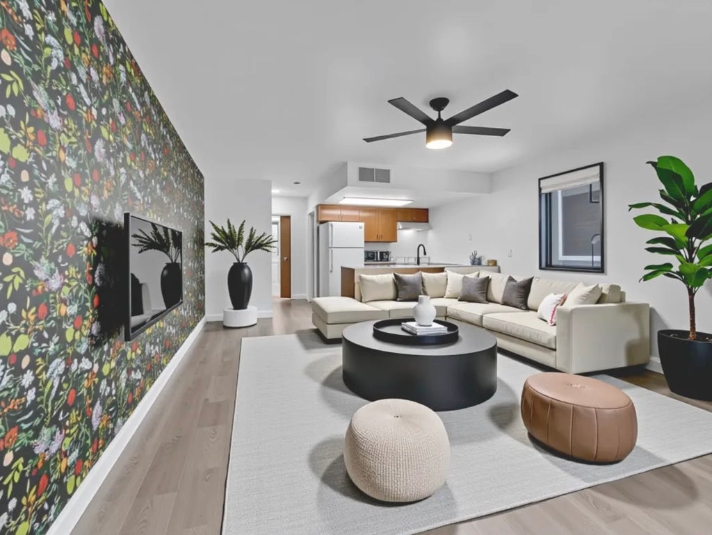 The open-concept layout creates a spacious feel, and the unit is equipped with a stackable washer and dryer for added convenience.