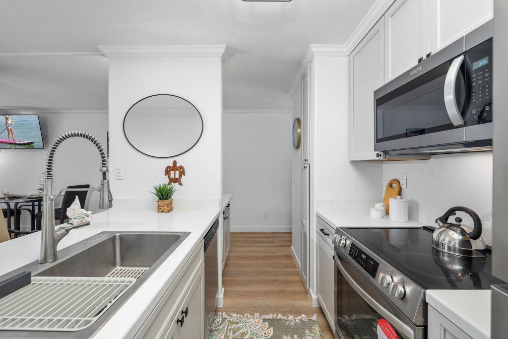 Inside, the unit has been thoughtfully updated with modern coastal finishes, featuring quartz countertops, stainless steel appliances, custom cabinetry, and luxury vinyl plank flooring that brings warmth and sophistication to every space. The open-concept layout flows effortlessly from the kitchen to the living area, extending out to your private lanai where ocean breezes and the sound of waves set the tone for unforgettable mornings and golden sunsets.