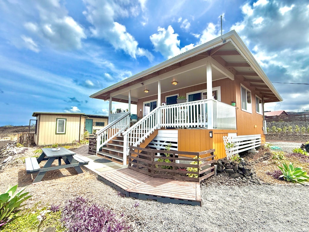 BACK UP OFFERS WELCOME! Spectacular ocean & sunset views await at this turnkey furnished property on 3 acres in the gated Kona Gardens Estates. The permitted 1-bed, 1-bath main home (480 sq ft) features a covered lanai (192 sq ft) perfect for enjoying panoramic views. Two beautifully finished studios and a large workshop add versatile living & workspace options.