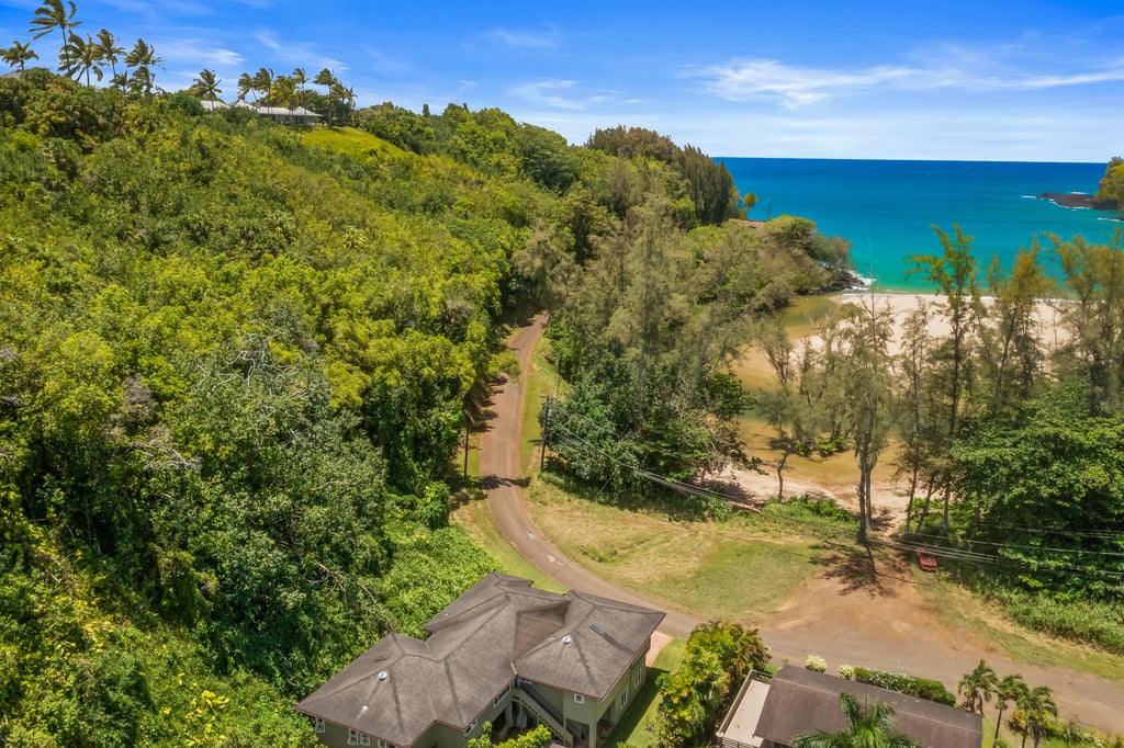 Exceptional quality beach home in an idyllic north shore location! Nestled at the end of a quiet road where the river meets picturesque Kalihiwai Bay. Stroll to the beach for a swim or enjoy a peaceful paddle up the Kalihiwai River to explore waterfalls. Launch a boat, canoe or kayak for a relaxing ocean trip or fishing, and a surfboard for outstanding surf! Expert craftsmanship is apparent in this home of 3,131sqft under roof (inclusive of 586sqft of covered lanai space) all located upstairs with an elevated perspective of the bay and tropical surroundings. Outstanding oversized chef-quality kitchen and formal dining area offer tantalizing ocean views and are connected to a covered lanai perfect for Hawaiian-style indoor/outdoor living. Second living room is it's own defined space complete with a fireplace for ambiance and warmth on cool winter evenings and its own wet bar, half bath and private lanai. Two spacious bedroom suites, one ocean view, the other garden view, and ability to add a third. Custom luxury baths feature double sinks and floor-to-ceiling tilework in showers. Take advantage of the bonus space off the current primary bedroom, perfect for a large home office, nursery or den/reading nook. Numerous upgrades including hardwood flooring through out, custom cabinetry and granite stone countertops in kitchen and baths. Oversized 2-car garage (672sqft) on the lower level, beneath the home, includes extensive storage or work space plus an additional enclosed storage room (180sqft). Perfectly manicured yard designed for easy maintenance. Unit B of a 2-unit CPR. Septic leach field is a common element (each unit has their own tank). This unit (B) is allowed up to three bedrooms.