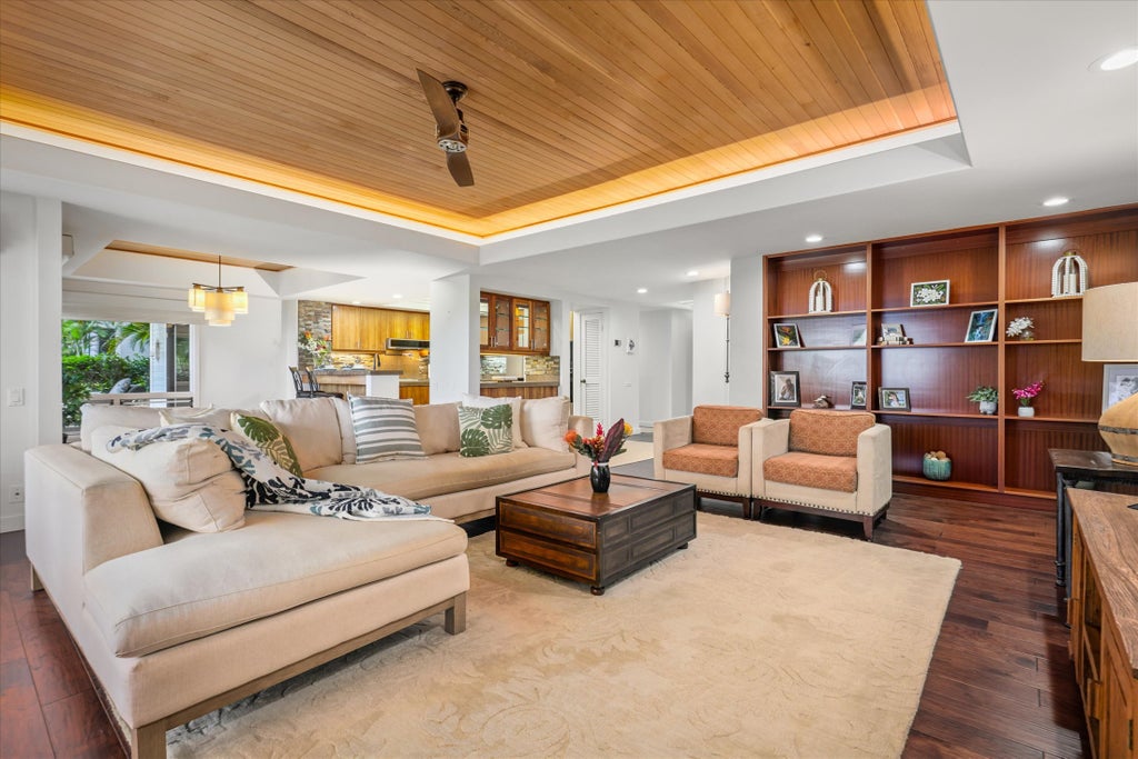 The newer Daikon central AC system keeps it cool even on our hottest summer days. This elegant home boasts Koa cainets, stone countertops, vessel sinks, bidet, walk in showers, soak tub, engeneered hickory hardwood flooring, spacious bedrooms, and high ceilings. Hale Kehau is pet friendly and the condo comes with covered parking, outside storage both outside the home and in the parking garage. This home comes funished (minus staging equip) and with a golf cart.