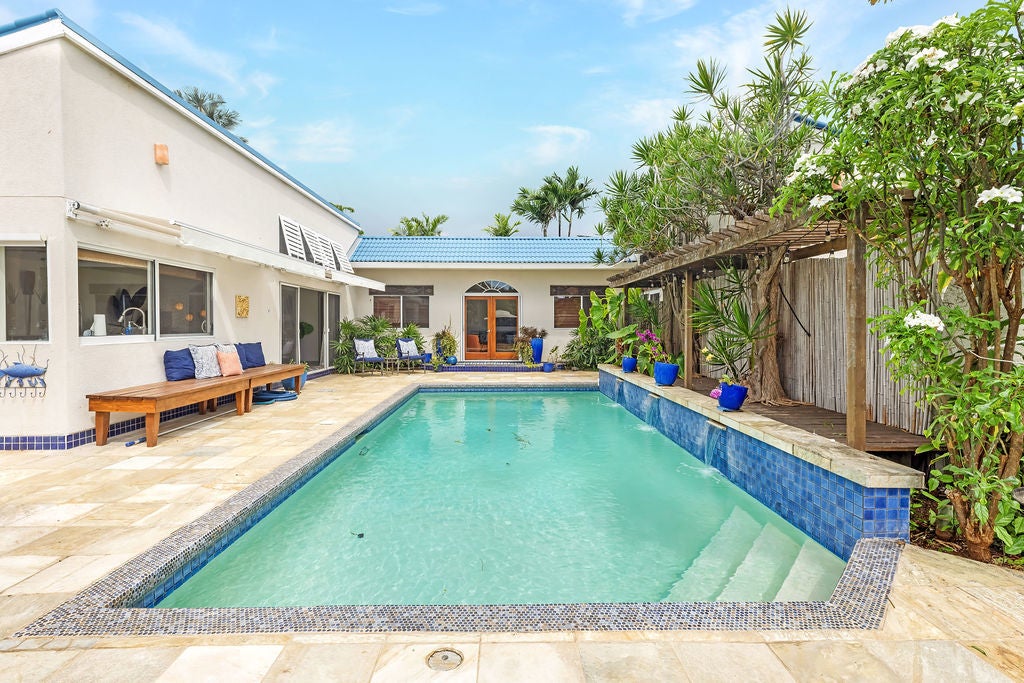 Pictures alone can’t capture the essence of this stunning U-shaped 3-bedroom, 2-bath oasis with a central courtyard, pool, and ocean views in the heart of Kona town! Truly built for entertaining, the home wraps seamlessly around the pool deck, creating a private retreat. Cool off in the pool, relax on the surrounding lounge chairs, or grill under the covered patio, complete with bar seating perfect for outdoor meals or serving guests. As the sun sets, gather around the fire table to take in vibrant skies and ocean views.