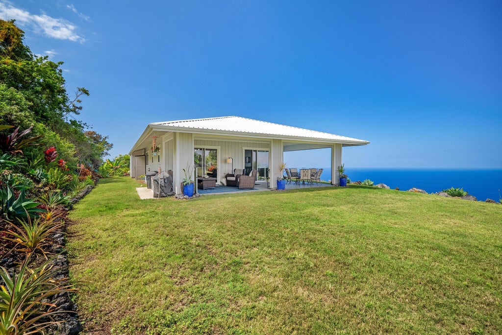 Custom built 2023 home! This 3-bedroom, 2-bath home showcasing dramatic drop-off views along the coastline from south to north, with nightly sunsets and even distant views of Maui. The open floor plan is designed for entertaining, with spacious lanais perfect for enjoying ocean breezes or dining against a stunning sunset backdrop. The primary suite also features its own private lanai—a peaceful retreat where you can sip morning coffee, read a book, or simply relax. The kitchen is a showpiece, highlighted by a bamboo island with a built-in cooktop, creating both beauty and functionality. Set on five acres, the property already produces bananas, pineapples, and a variety of citrus, with ample space ready for additional planting. The favorable elevation and rainfall make this location ideal for cultivating a wide range of tropical fruits and flowers. This property is part of a small gated subdivision, offering both privacy and security, while providing easy access to the highway. A rare combination of modern comfort, acreage, and panoramic Big Island beauty. Don’t miss the attached virtual tour!