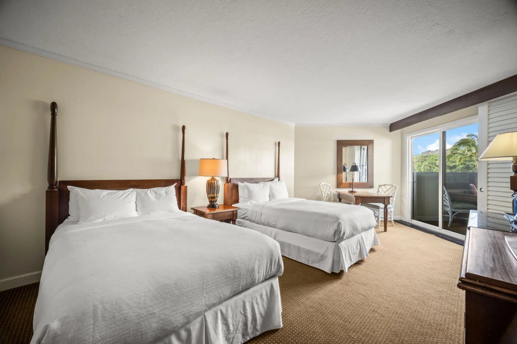 Lowest priced fee-simple condo on Kauai! A beautiful unit at Kauai Beach Resort with a mountain and garden view. These are studio units that include a studio room, full bathroom and lanai. This unit also features two double beds. This unit is being managed through the Outrigger and is rental ready for its next owner. Kauai Beach Resort is located right on the beach and is within close distance to Kapaa town, Lihue town and the airport. This resort also includes many amenities like restaurants, gym, resort sized pool and more.
